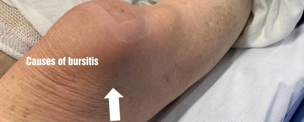 As discussed above, repetitive motion can cause bursitis, such as weight lifting or pitching a ball. Spending prolonged periods in a specific posture that puts pressure on a particular body part can also cause bursitis.
